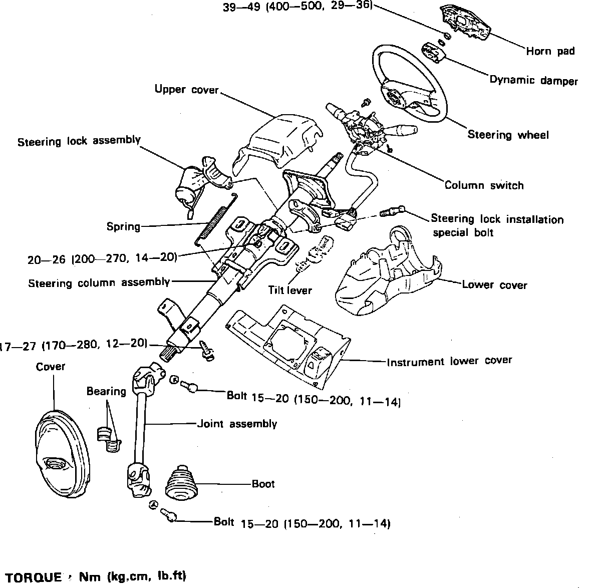6. Remove dust cover bolts, then remove steering column shaft along with universal joint and dust cover.