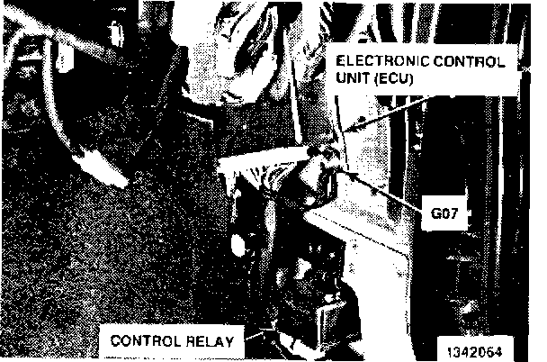 2. Disconnect the connectors from the ECU and Control Relay. Remove the two bolts securing ECU and the ground wires (G07). Remove the ECU and swing the ECU bracket to the side and pull the Control wiring harness out from behind.