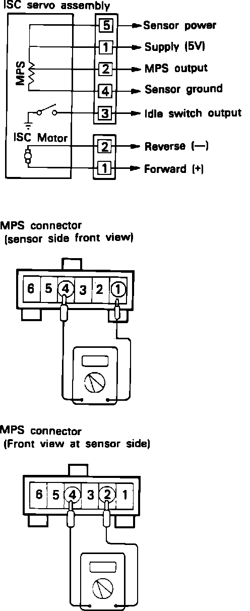 4. Connect a 6V battery between terminals 2 and 1 of the ISC motor connector (to operate the ISC motor) and check to see that resistance of the MPS (step #3 hook-up) changes smoothly when the ISC motor is activated.