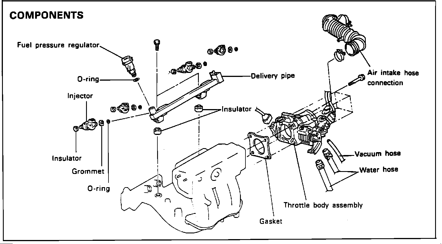 6. When installing the fuel rail, check to be sure that the rail insulator is correctly inserted into the installation holes. Tighten the mounting bolts to 7.2 - 9.4 lb.ft (100 - 130 Kg.cm).