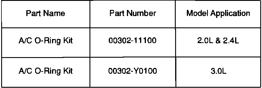 The A/C O-ring will be supplied to each dealer in kit form on a one time basis. After the initial kits are used up, dealers will then revert to normal parts ordering.
