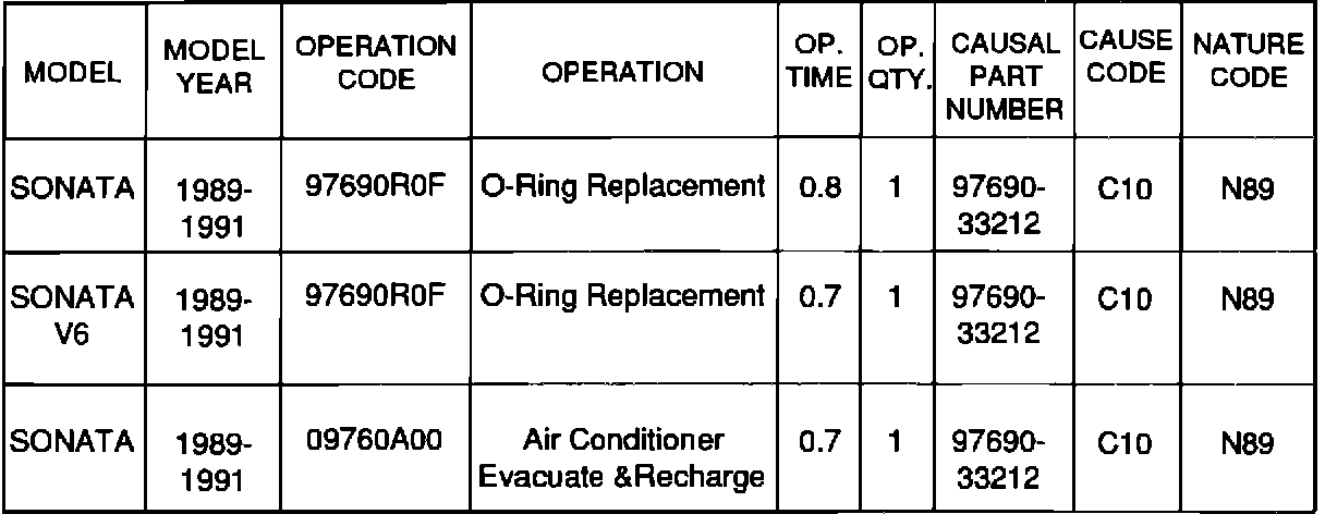 A/C O-ring kits are being supplied to dealers to resolve refrigerant leaks on Sonatas. There are two different kits; one for V6 Sonatas and one for 2.0L, 2.4L Sonatas. The kits contain O-rings for the entire A/C system (12 O-rings for V6, 10 O-rings for 2.0L & 2.4L). These new O-rings are thicker, 8.5 mm vs 8.0 mm, than the previous one. Both the new and previous O-rings are green.