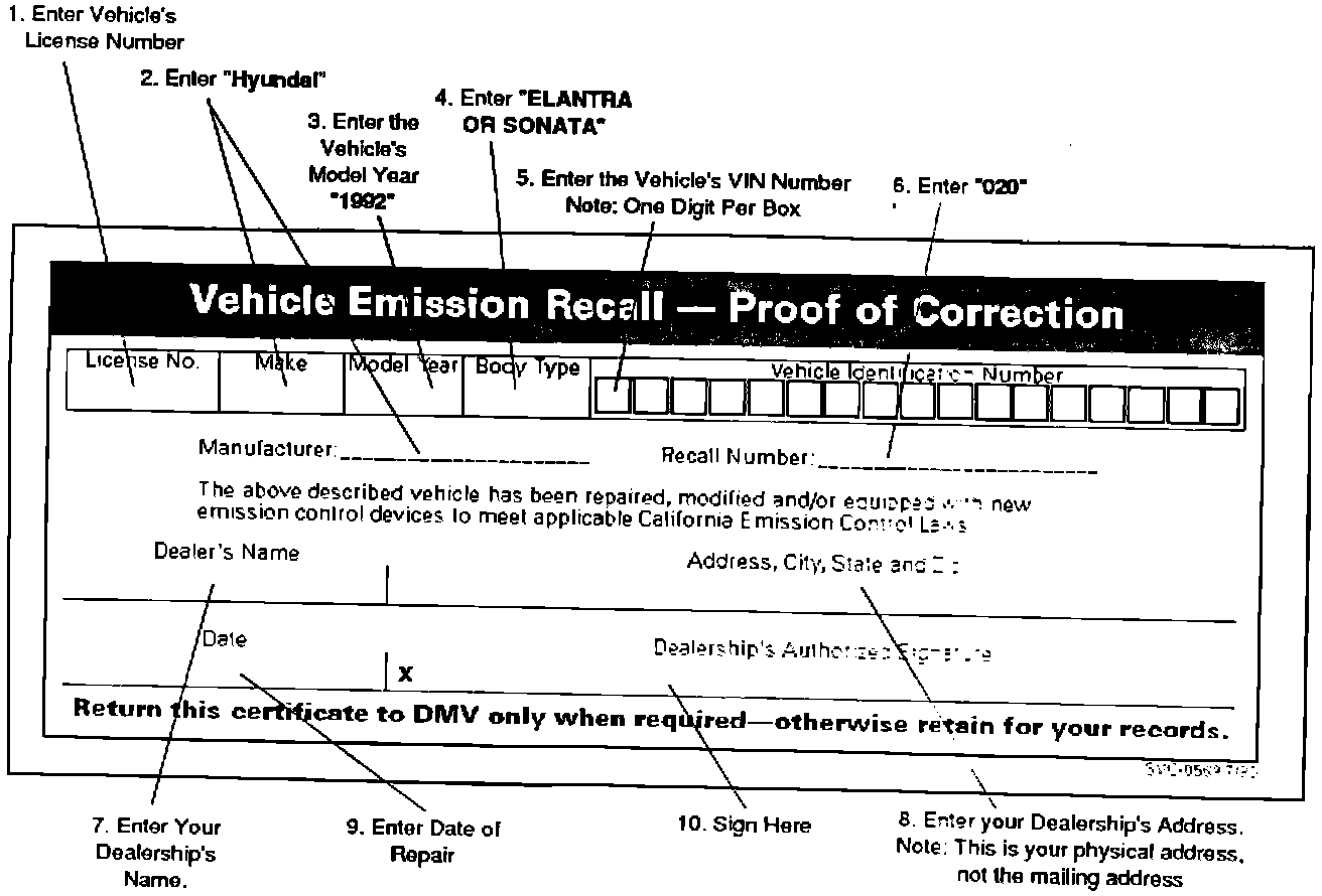 California residents who own an affected vehicle may be required to send a Vehicle Emission - Proof of Correction form to the Department of Motor Vehicles (DMV) as evidence of recall completion when they apply for vehicle registration renewal. Each customer whose vehicle is registered within California must be given a completed Vehicle Emission Recall - Proof of Correction form after the recall has been completed. Packages of this form have been sent to California dealers along with this bulletin. Additional forms are available by contacting your Field Technical Managers (FTM).