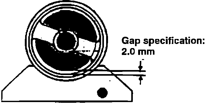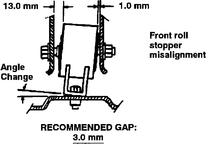 5. Check the front roll stopper mounting bracket angle. Vibration may occur if the angle of the front roll stopper mounting bracket is incorrect. Check gap difference between the left hand and the right hand sides of the insulator and bracket. If there is a gap difference of more than 3 mm, remove the bracket and grind the front stopper mounting bracket so that it fits perpendicular to its mount and creates an equal gap between the LH and RH sides of the insulator and bracket. Apply a paint primer to the ground surface of the bracket to avoid rusting. Re-install the front roll stopper mounting bracket and tighten to the specified torque (40-50 N-m, 400-500 kg.cm, 29-36 lb.ft.). See the illustration.