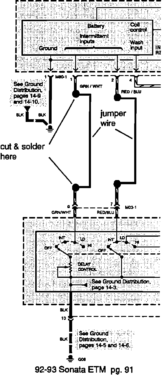 3. Cut the wires two inches from the ETACS connector (M80-2) [ pin # 1 gm/wht and pin # 2 red/blu ] and the wipers switch connector (M03-1) [pin # 9 gm/wht and pin # 7 red/blu ] cut the wires.