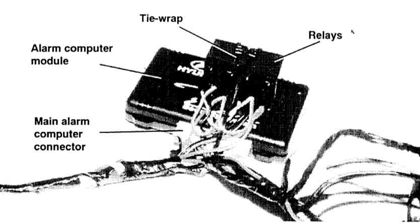 2. Using long tie wraps, tie wrap the relays to the alarm computer module. These tie wraps can be routed around the main alarm computer connector to also secure the connector to the alarm computer module.