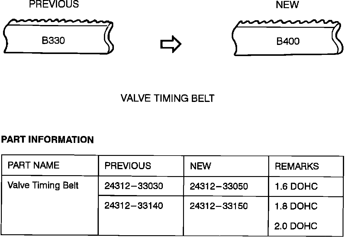 The material of the valve timing belt on 1.6, 1.8 & 2.0 DOHC vehicles has been changed from B330 to B400 to increase its durability.