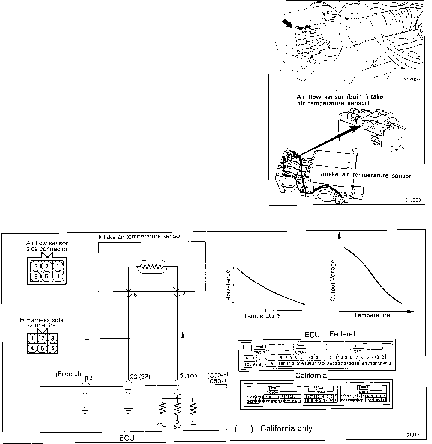 The Intake Air Temperature Sensor is a thermistor that measures intake air temperature as a resistance value. The resistance of the sensor increases as temperature decreases. The ECU modifies fuel injection duration according to the intake air temperature signal.