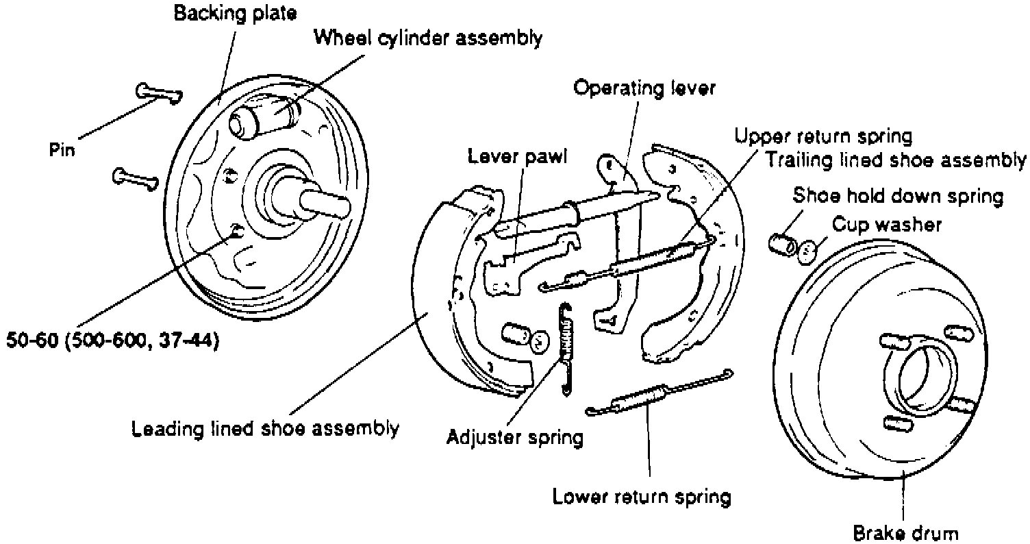 1. Raise and support vehicle, then remove wheel/tire assembly.Exploded View Of Drum Brake Assembly: