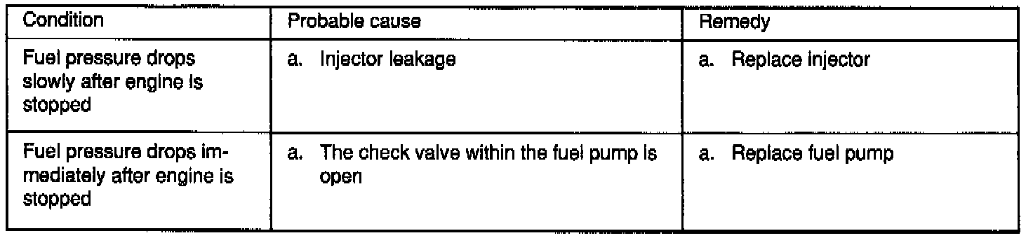 9. Stop the engine and check for a change in the fuel pressure gauge reading, which should hold for approximately 5 minutes. It the gauge indication drops, observe the rate of drop. Determine and remove the causes according to the following table.