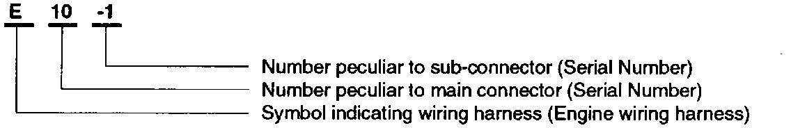 A connector identification symbol consists of a wiring harness location classification symbol corresponding to each other wiring harness location and number peculiar to the connector. These connector locations can be found in the WIRING HARNESS LAYOUT.