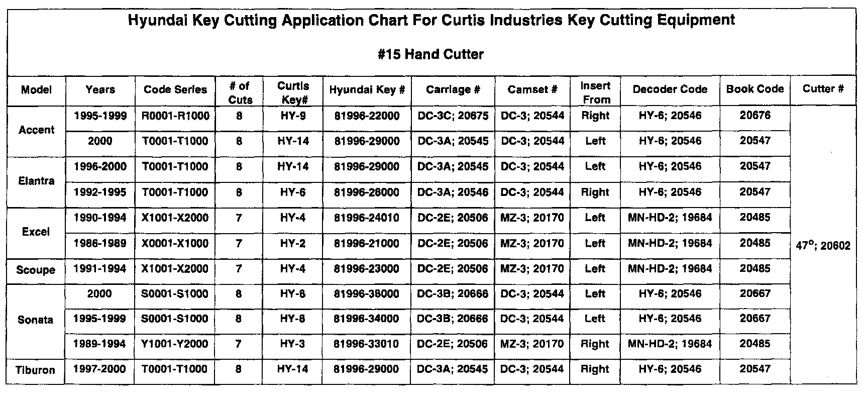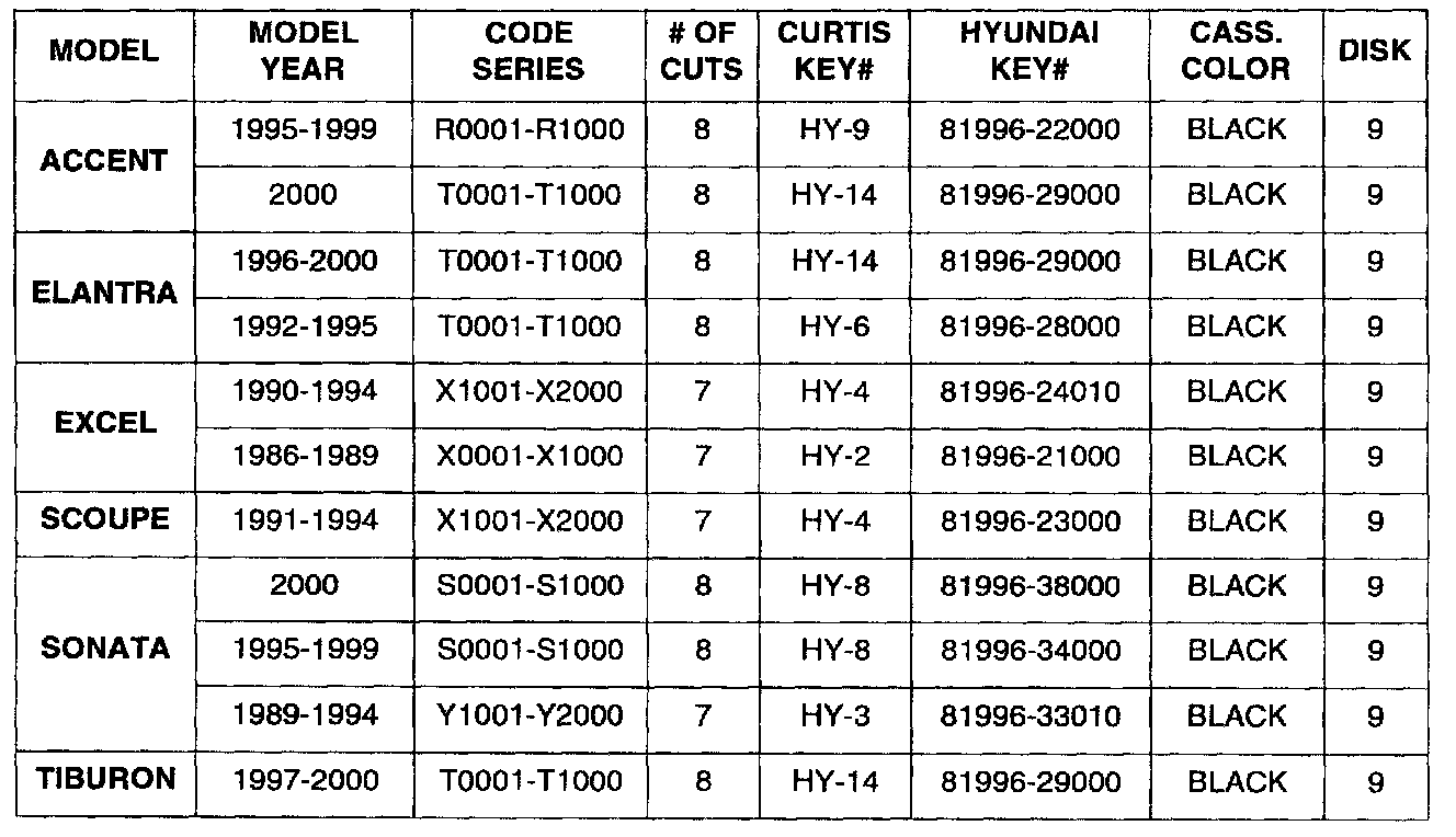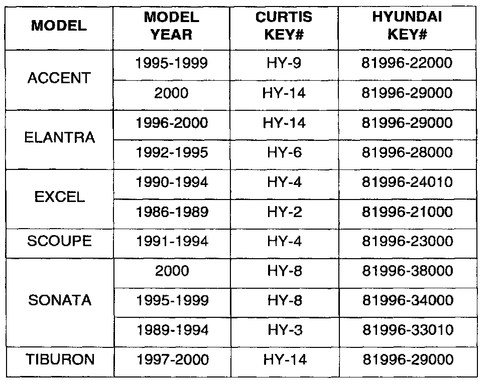 This bulletin provides key cutting information for all Hyundai vehicles using Curtis Industries key cutting equipment. You may either order the factory keys from Hyundai, through your facing PDC, or order stamped keys from Curtis Industries.