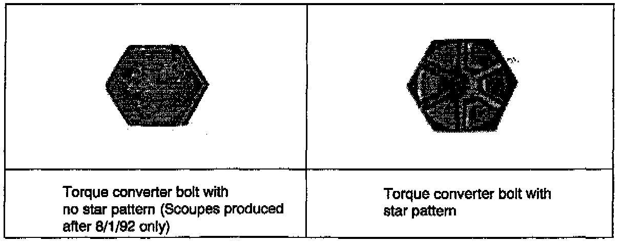 Scoupes produced after 8/1/92 do not use a bolt with a star pattern. These transaxles are shipped with the bolts installed in the torque converter.