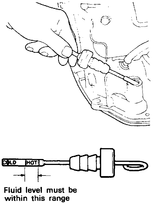 6. Check to see if the fluid level is in "HOT" range on dipstick. If fluid is low, add automatic transaxle fluid until level reaches the "HOT" range.
