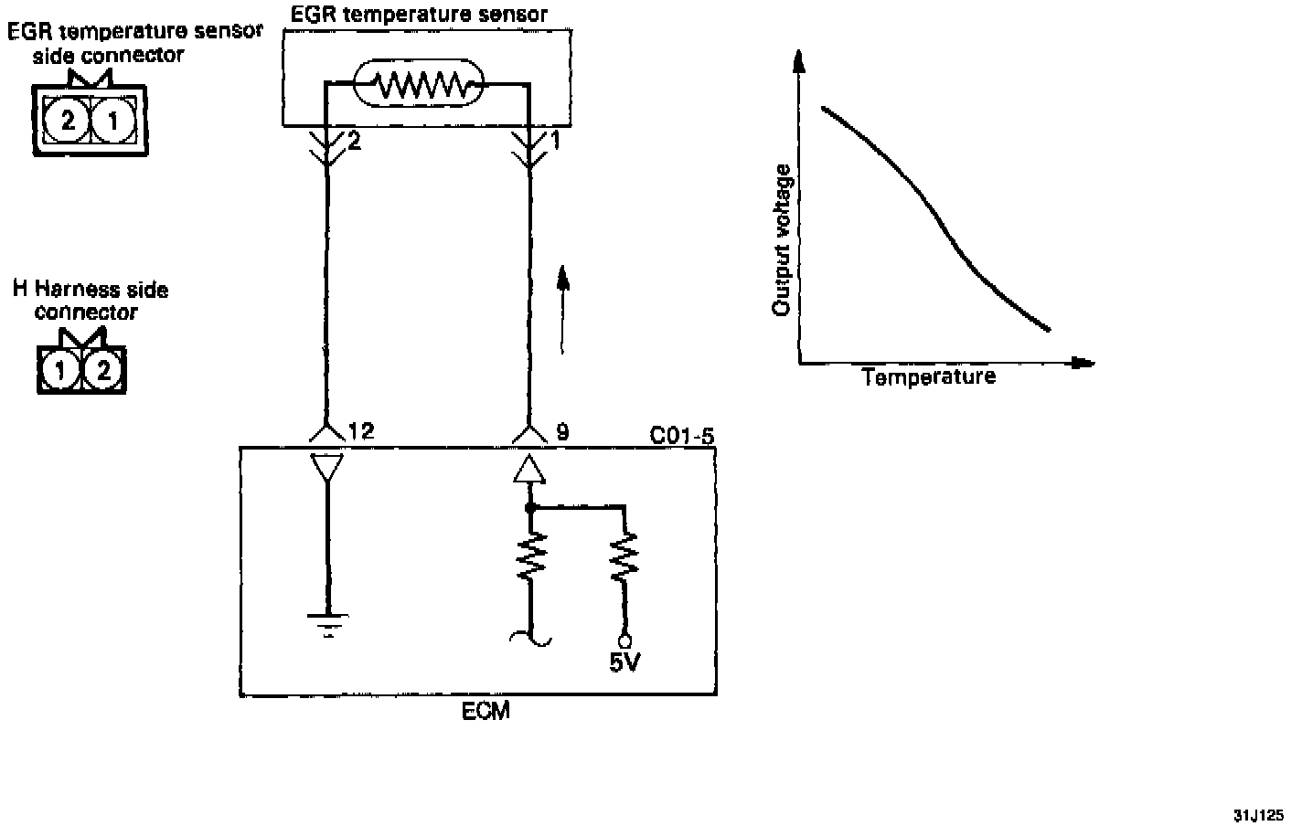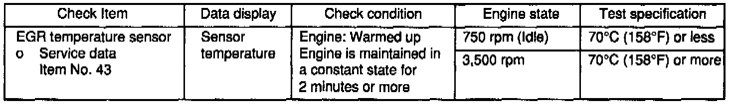 The exhaust gas recirculation temperature sensor converts the temperature of exhaust gas recirculation gas downstream from the exhaust gas recirculation valve to voltage and inputs it to the engine control module. The engine control module judges the condition of the exhaust gas recirculation by this signal. if there is abnormal condition, the engine warning light is turned on to notify the driver.