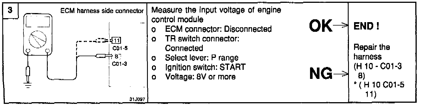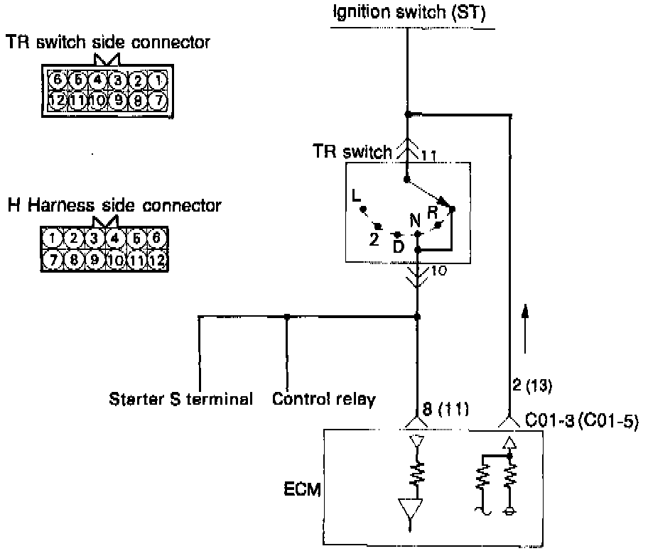When the ignition switch is in the ST position, the battery voltage is applied through the ignition switch and transaxle range switch to the engine control module.