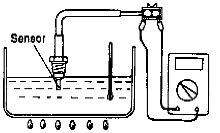 1. Place the exhaust gas recirculation temperature sensor in water, and then measure the resistance value between terminals 1 and 2 while increasing the water temperature.