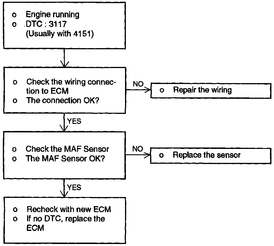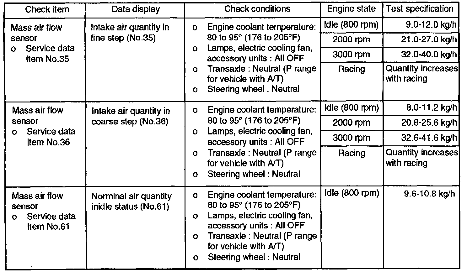 3. If the engine can be idle even if the mass air flow sensor output voltage is out of specification, check for the following conditions;