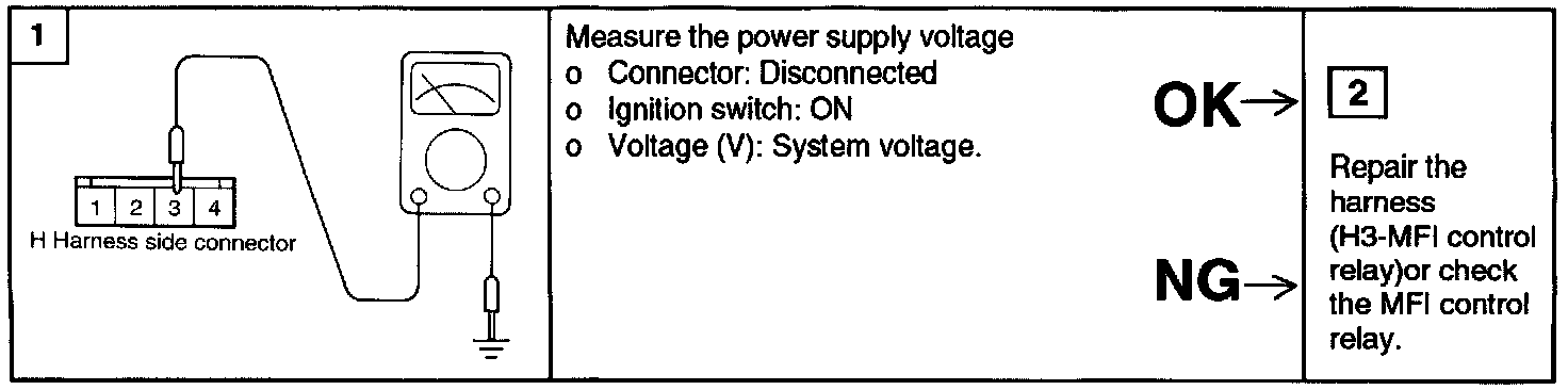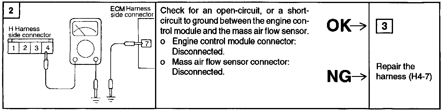 2. If the mass air flow sensor output voltage is other than the ignition switch is turned on (do not start the engine). Check for the faulty mass air flow sensor or engine control module.