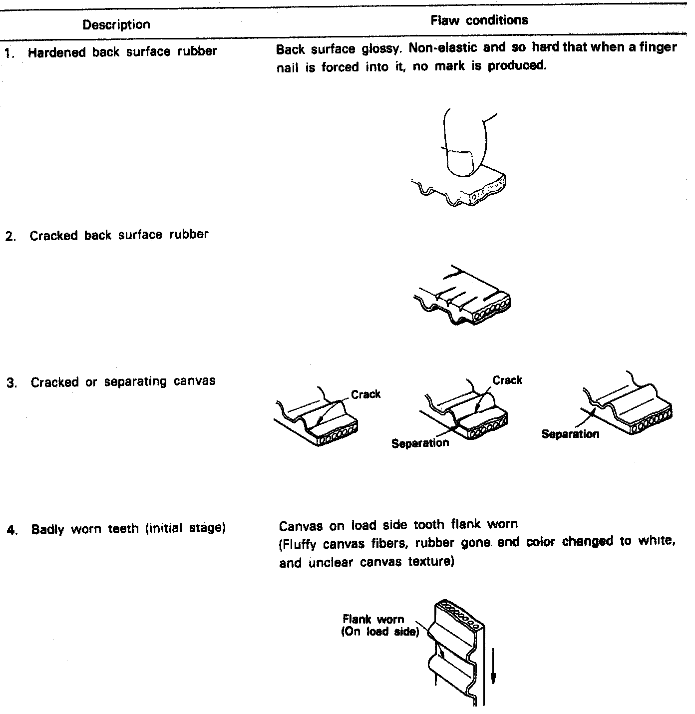 2. When the engine is overhauled or belt tension adjusted, check the belt in detail. If flaws are evident, as shown in images, replace the belt with a new one.