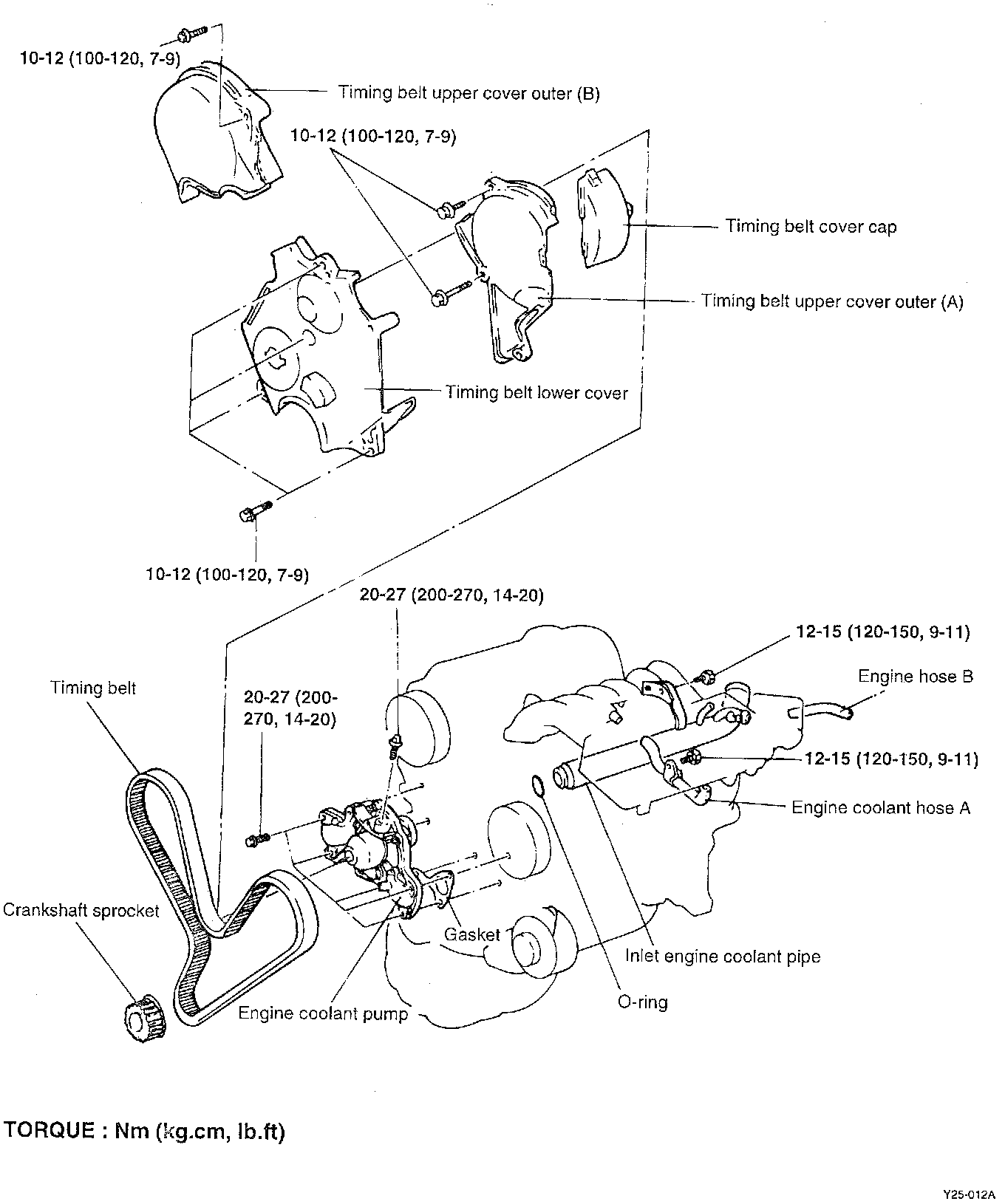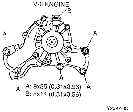 1. Drain the coolant and disconnect the radiator outlet hose and engine coolant bypass hose from the engine coolant pump.