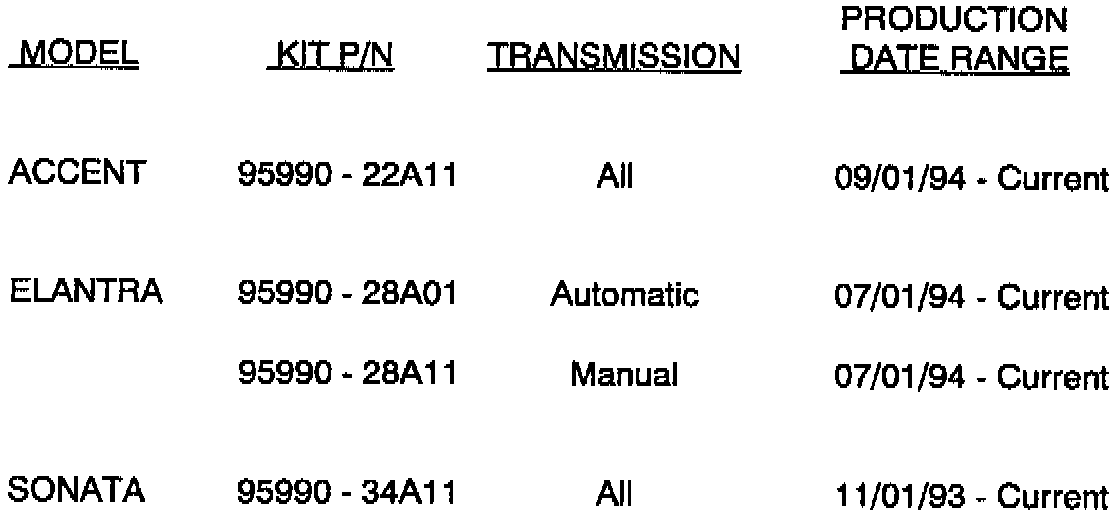 Hyundai has developed air bag repair kits to assist dealers when ordering all of these components. The air bag repair kits include items 2 - 5 as listed above. In addition to ordering the air bags (which are color specific), an air bag repair kit should also be ordered. The part numbers for these kits are illustrated.