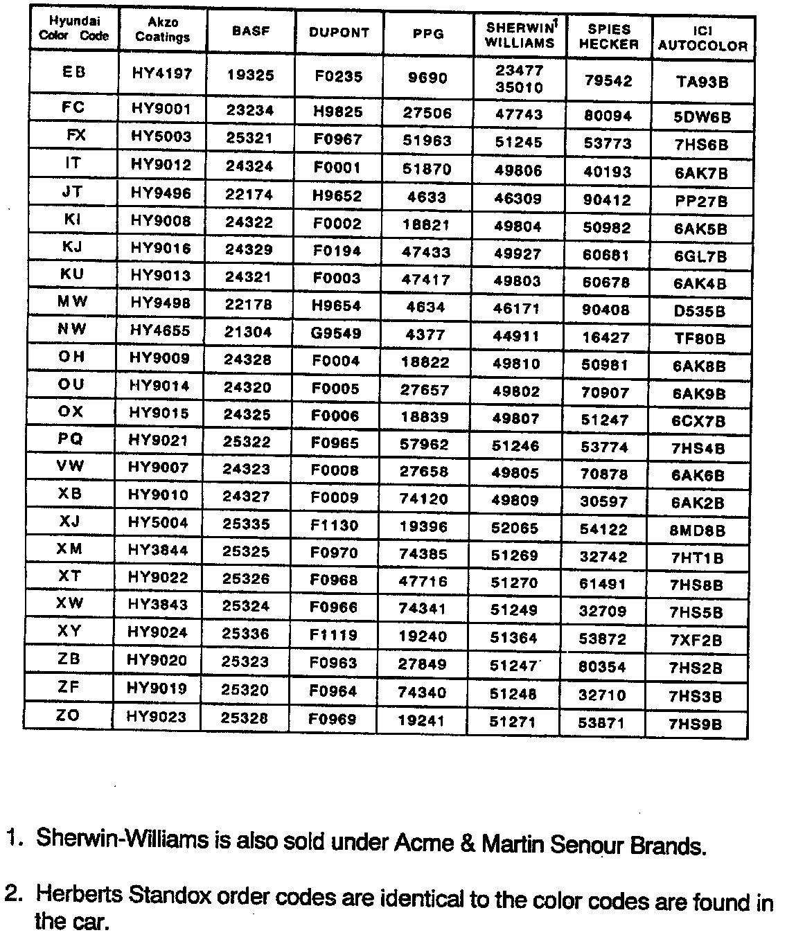 TABLE 1: 1995 HYUNDAI EXTERIOR COLOR CODES AND APPLICATIONS