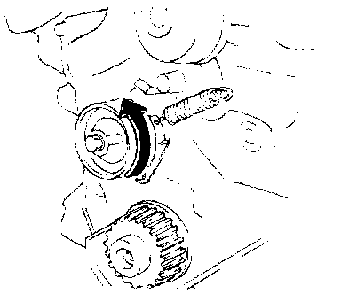 3. Rotate the timing belt tensioner to the extreme counterclockwise along the elongated hole. Temporarily lock the timing belt tensioner in place.