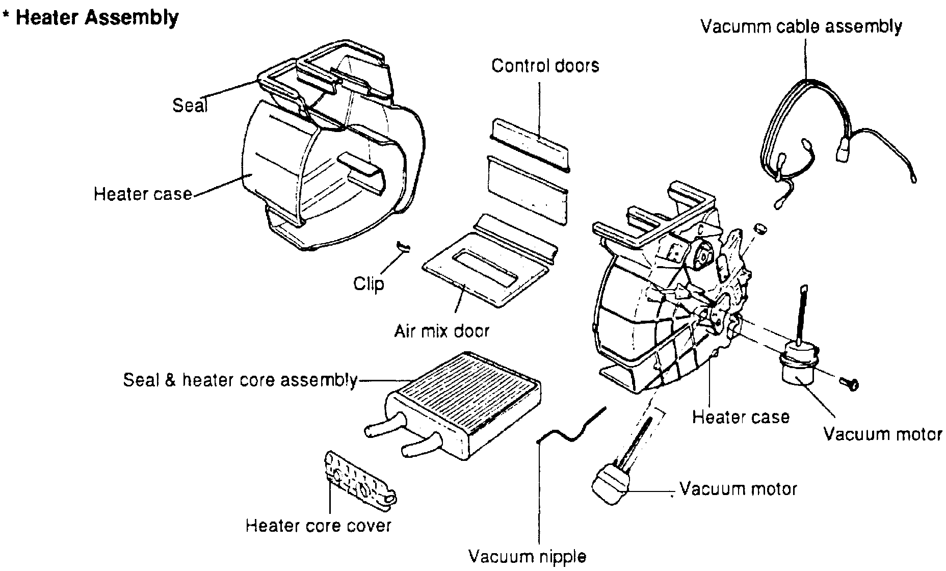 24. Disconnect connection at both sides of heater core cover and remove cover and vacuum nipple.