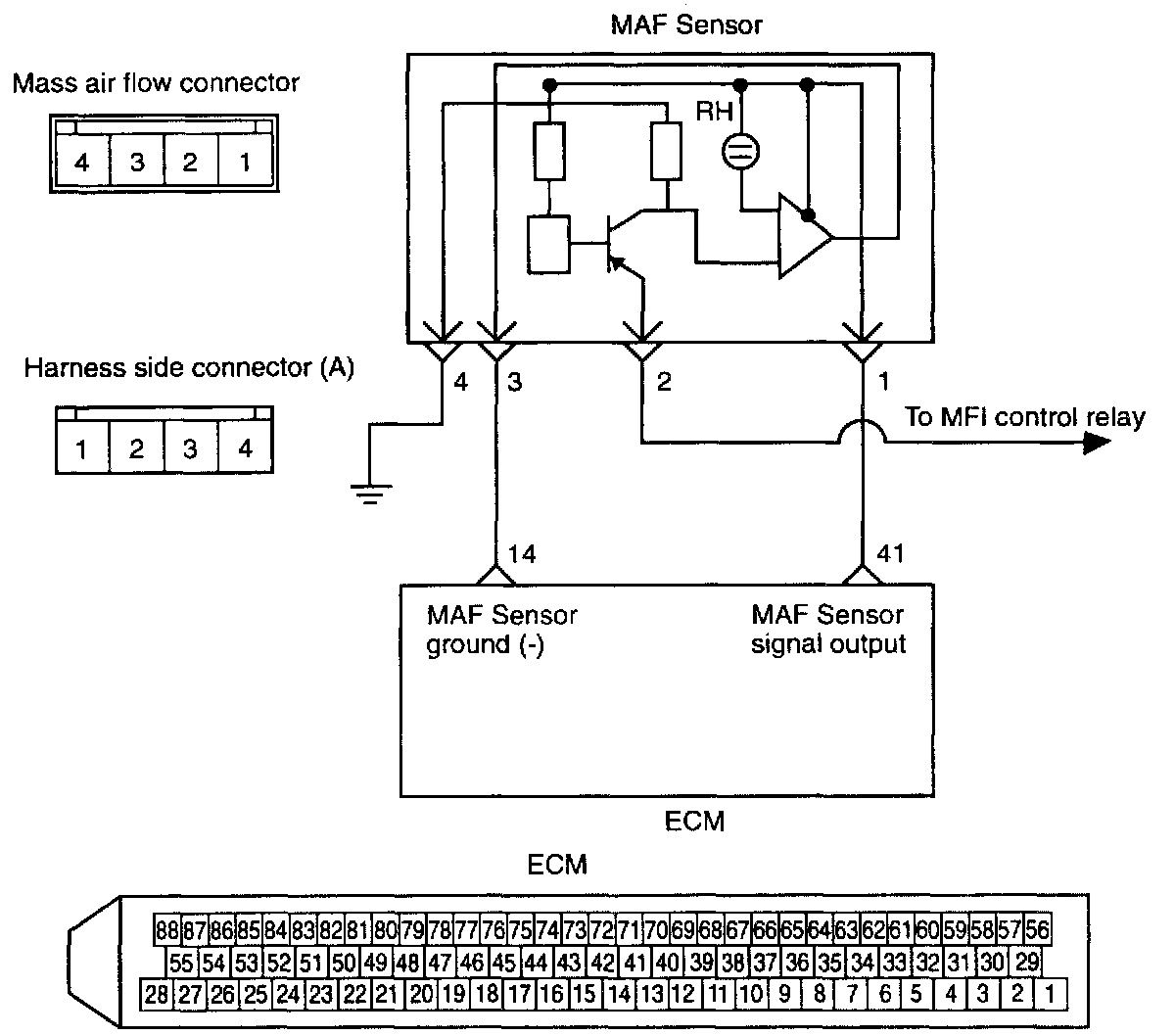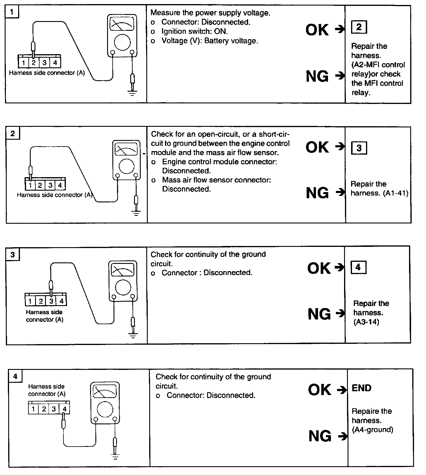 2. If the MAF sensor output voltage is other than 0 when the ignition switch is turned on (do not start the engine). Check for the faulty MAF sensor or ECM.