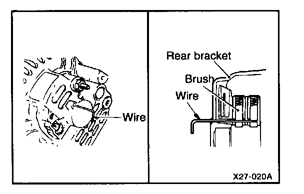 Before the rotor is attached to the rear bracket, insert a wire through the small hole in the rear bracket to lock the brush. After the rotor has been installed, the wire can be removed.