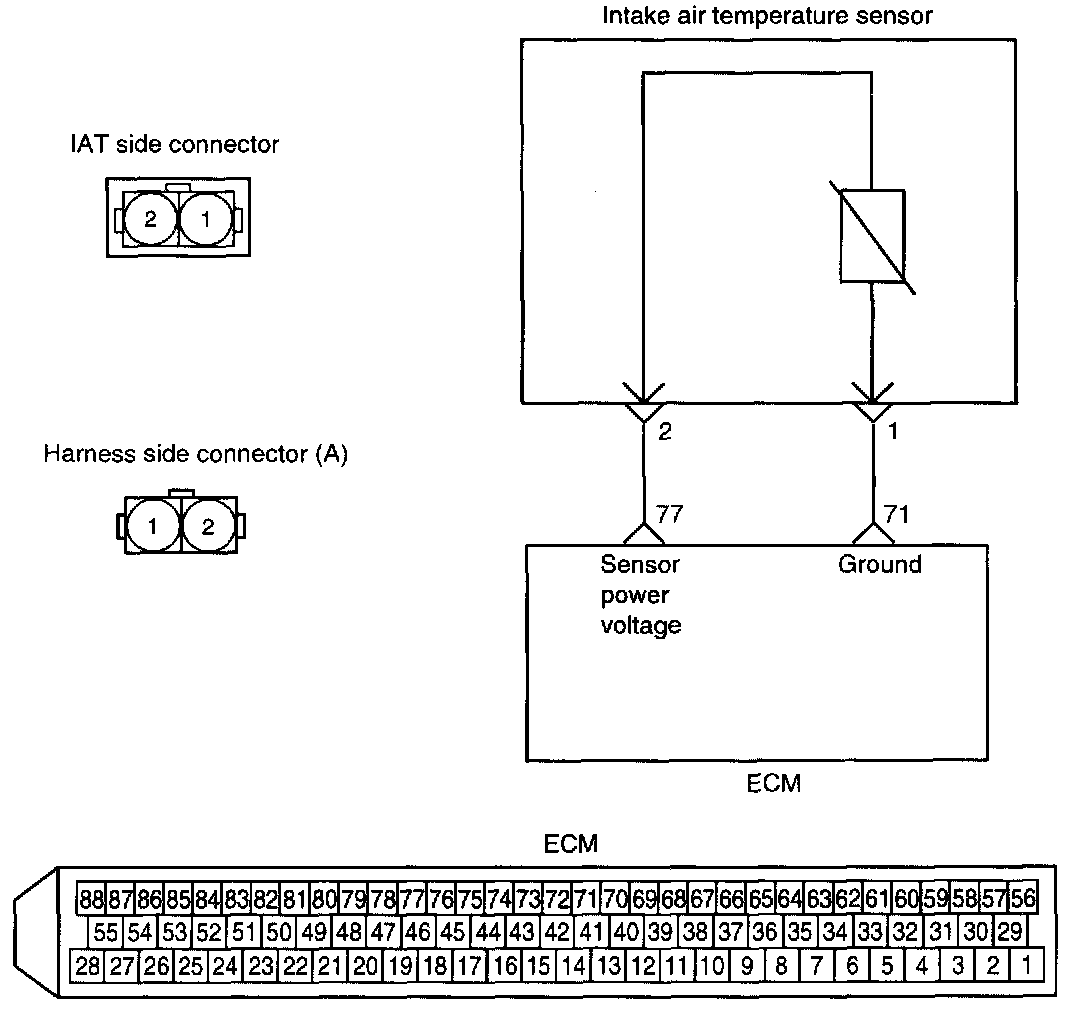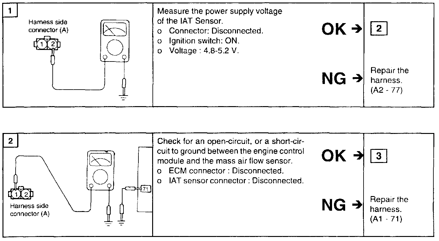 2. Measure the voltage between the IAT sensor terminal 1 and 2.