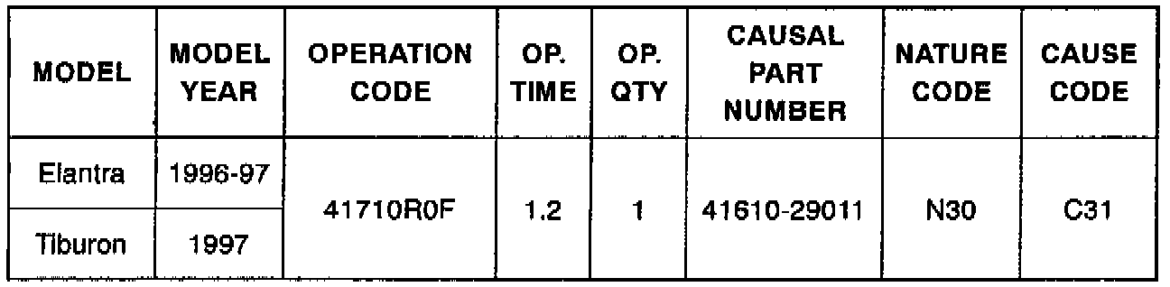 Some 1996-97 Elantra and 1997 Tiburon vehicles may experience clutch drag. This condition may be caused by a restriction in the hydraulic line from grease used during assembly of the clutch master cylinder. Effective with August 27, 1996 production, the assembly procedure has been changed to correct this condition.