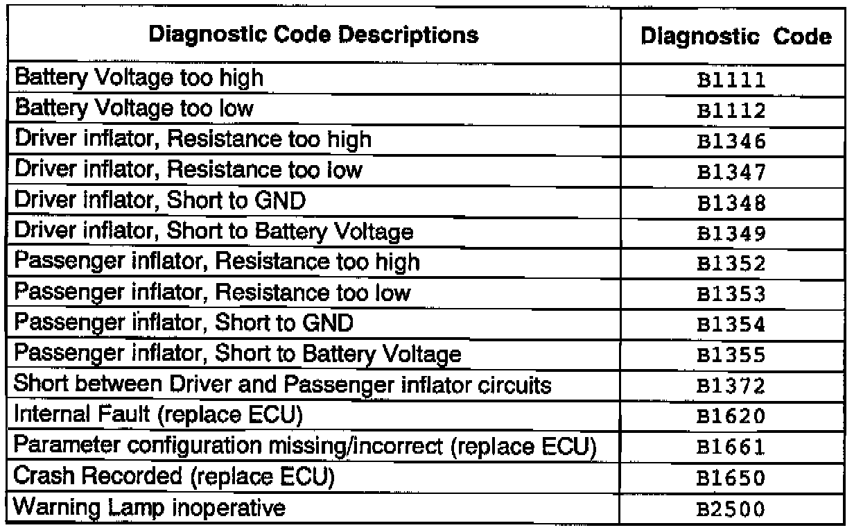 1996 model year SRS Diagnostic codes