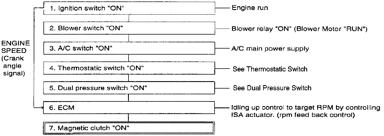 HOW IS THE MAGNETIC CLUTCH IS ENERGIZEDThe general process how the magnetic clutch is energized is shown. (MFI only)