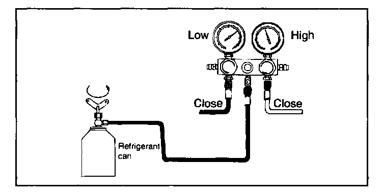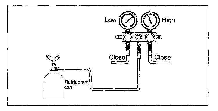 NOTE: Be sure to keep the container upright to prevent liquid refrigerant from being charged into the system through the suction side, resulting in possible damage to the compressor.