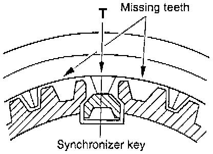 3. The synchronizer sleeve has teeth missing at six places. Assemble the hub to the sleeve so that the center tooth between the two missing teeth will touch the synchronizer key.