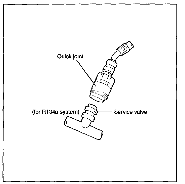 R-134a system employs new high and low service charge ports with "quick connect" adapters. Each adapter is a female fitting with threads on the inside to protect the system from contaminants. This type of change port is also expected to reduce refrigerant leakage.