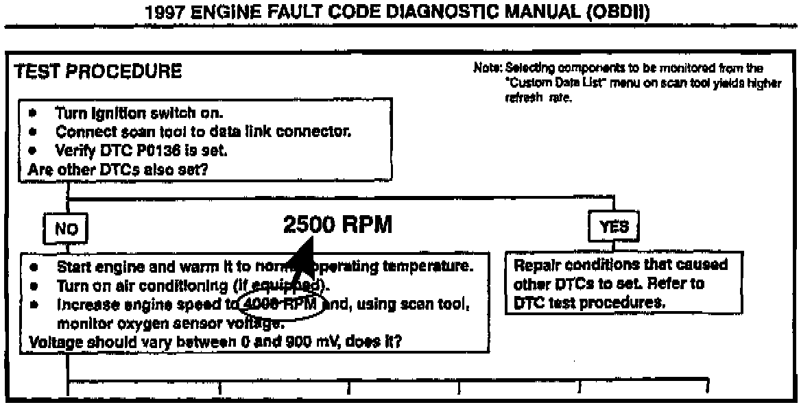 The second step of the Oxygen Sensor Testing Procedure flow chart in the 1997 Engine Fault Code Diagnostic Manual (OBD-II), part no. NP150-07001, is incorrect. The correct engine RPM is 2500.