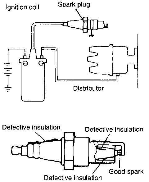 Connect a spark plug to the high tension cable, ground the outer electrode (main body), and crank the engine. If the spark plug is good, sparks will be produced in the gap. If the spark plug is defective, no sparks will be produced.