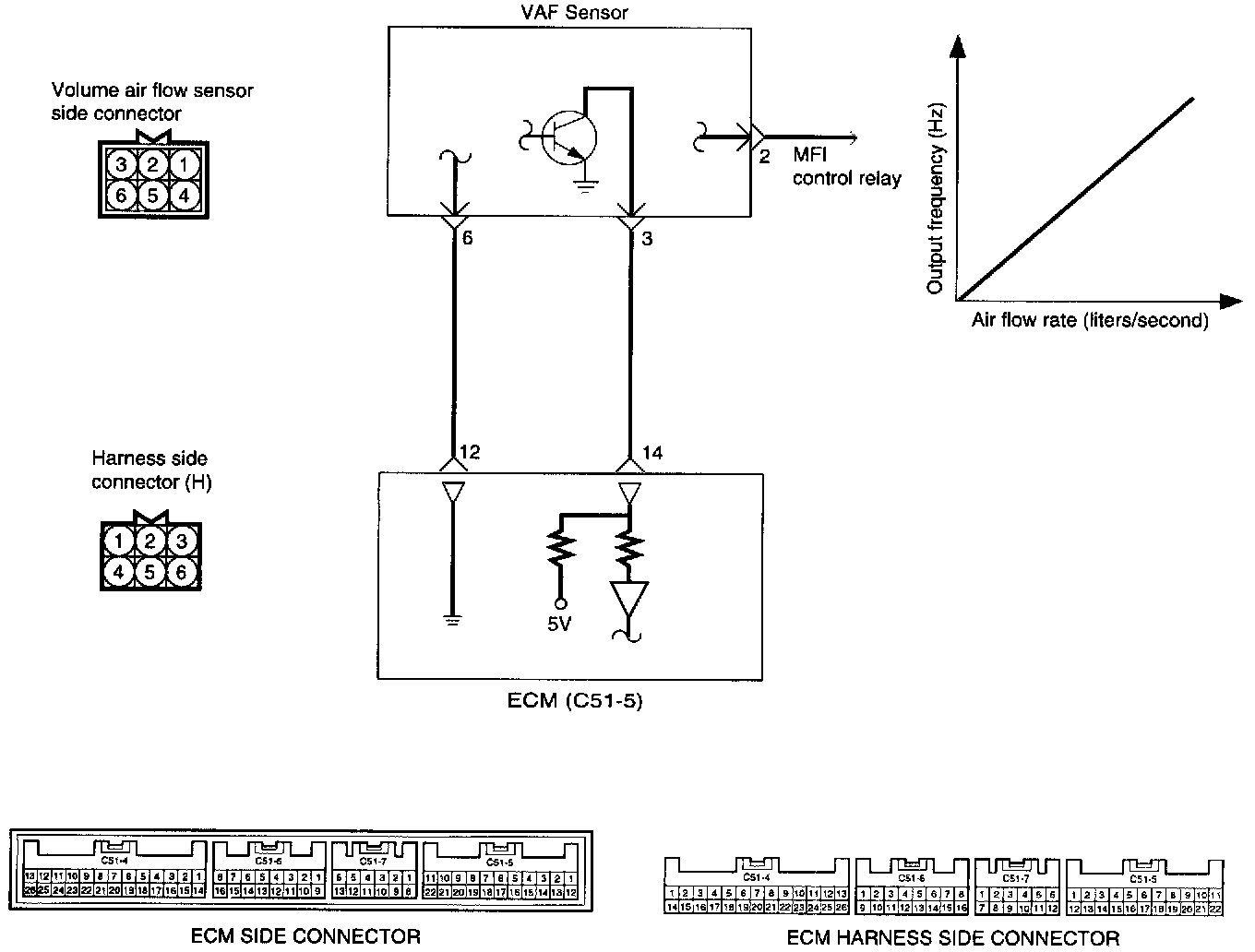 2. If the VAF Sensor output frequency is other than 0 when the ignition switch is turned on (do not start the engine), check for faulty VAF Sensor or ECM.