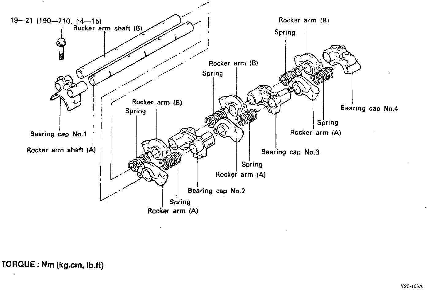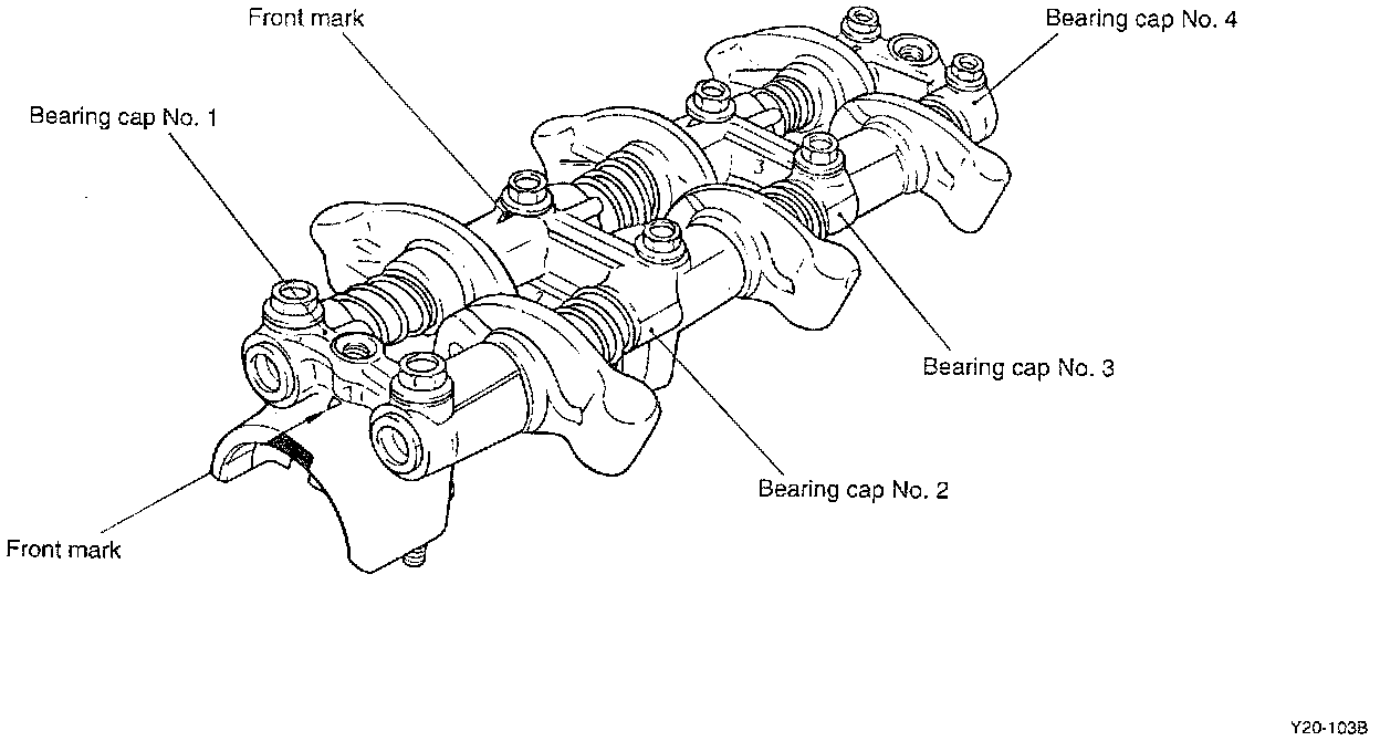Insert bearing cap No. 1 so that the notch on the end of the shaft faces in the direction shown in the illustration. Insert the mounting bolt.