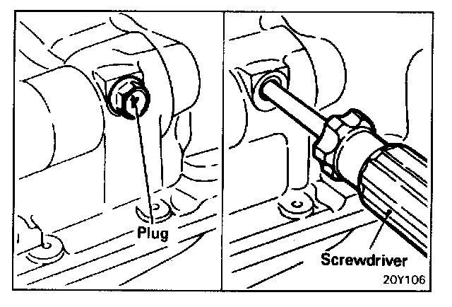 9. Remove the left side cylinder block plug and insert a screw driver with an 8 mm (0.32 inch) diameter shaft into plug hole. Screwdriver shaft must be inserted more than 60 mm (2.4 inch)