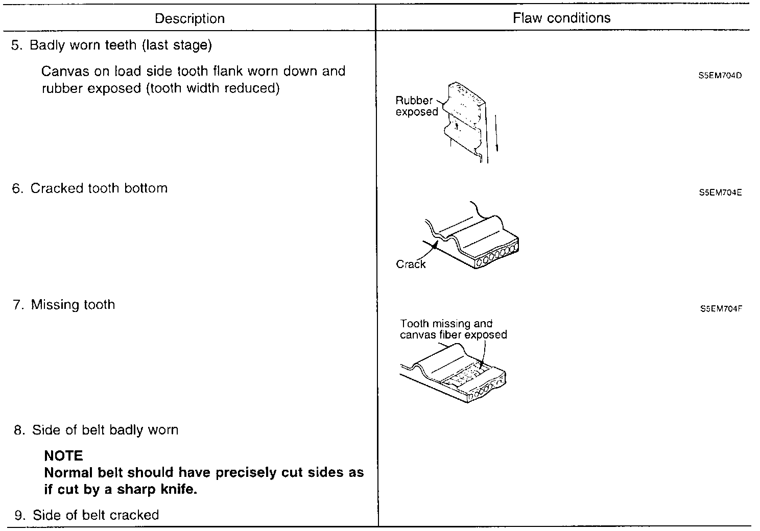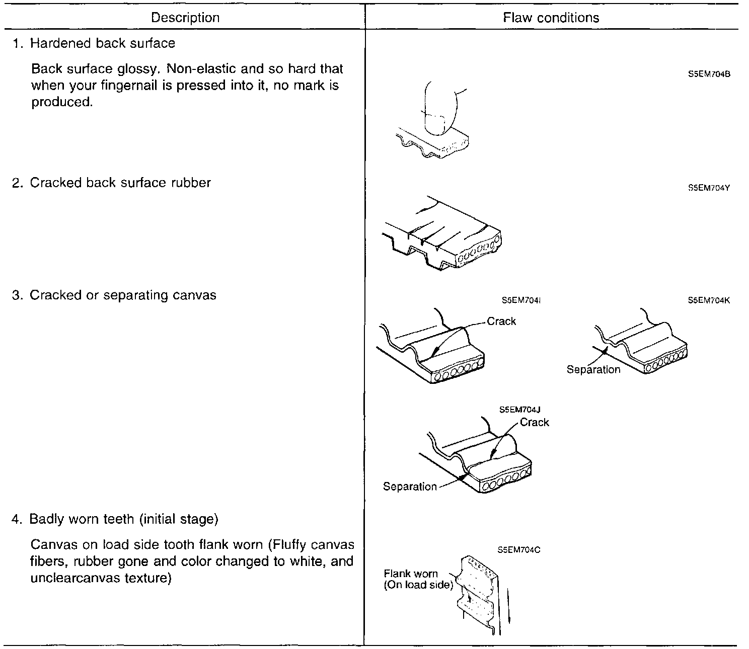 2. When the engine is overhauled or belt tension adjusted, carefully check the belt. If any of the following flaws are evident, replace the belt.