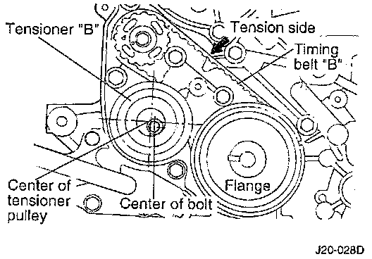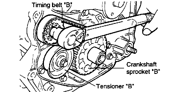 6. Lift tensioner "B" to tighten timing belt "B" so that its tension side will be pulled tight. In this condition, tighten bolt to secure tensioner "B". When bolt is tightened, use care to prevent shaft from turning together. If shaft is turned together, belt will be overtightened.