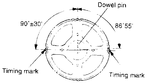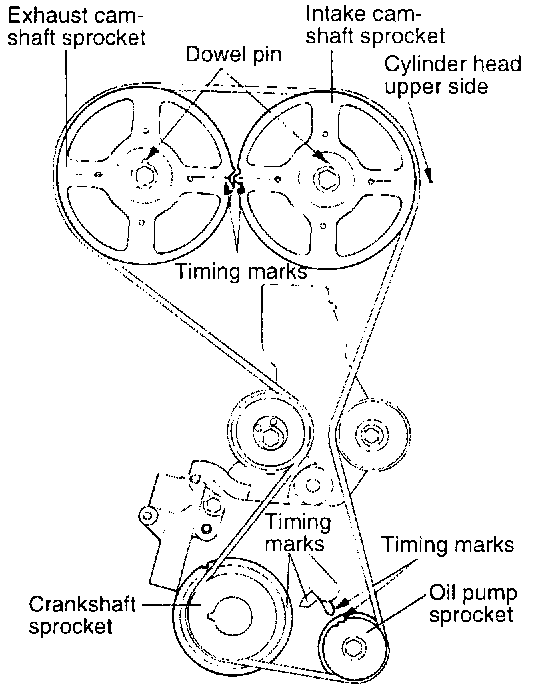 At this time the timing marks of the camshaft sprocket and the upper surface of the cylinder head should coincide, and the dowel pin of the camshaft sprocket should be at the upper side.