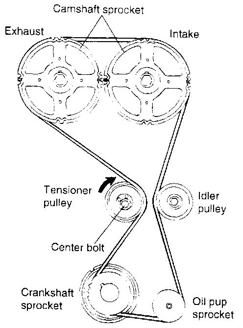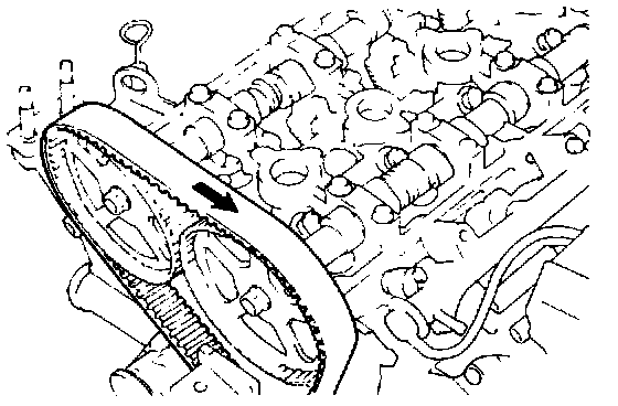 22. Turn the exhaust camshaft sprocket one tooth clockwise to align its timing mark with the cylinder head top surface [see illustration in step 15]. Then, pulling the belt with both hands, install it around the exhaust camshaft sprocket.