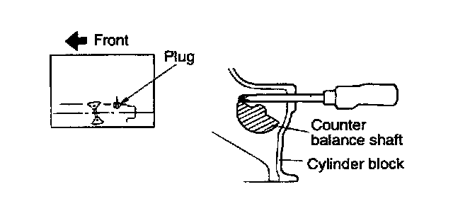 6. When the oil pump sprocket nut is removed, first remove the plug at the left side of the cylinder block and insert a screwdriver to keep the left counter balance shaft in position. Use a screwdriver with a shaft measuring 8 mm (0.3inch) in diameter which can be inserted being more than 60 mm (2.36 inch)