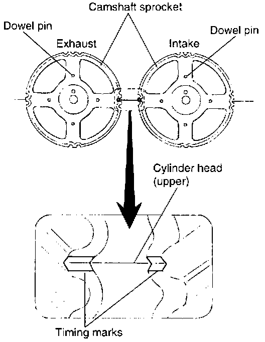 15. Turn the two sprockets so that their dowel pins are on top. Then, align the timing marks facing each other with the top surface of the cylinder head.
