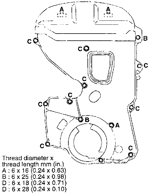 CAUTION: After timing belt "B" has been removed, do not attempt to loosen the bolt while holding sprocket with pliers, etc..
